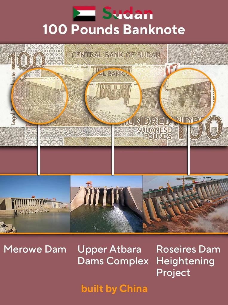 ↑蘇丹面額100蘇丹鎊紙幣——麥洛維大壩、上阿特巴拉水利樞紐和羅賽雷斯大壩。