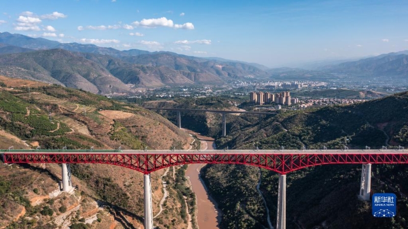 11月23日,復興號列車通過中老鐵路元江特大橋(無人機照片)。
