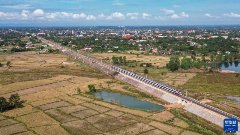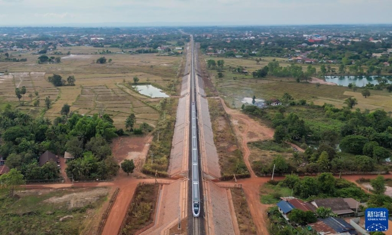 這張11月25日的航拍照片顯示,“瀾滄號”動車組行駛在老撾萬象郊外的中老鐵路老撾段上。新華社發(fā)(凱喬攝)