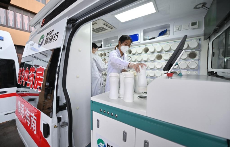 2022年8月20日,在海南三亞一家酒店附近,工作人員在“流動應急智能中藥房”里將盛有單味中藥濃縮顆粒的藥瓶放入發(fā)藥機。新華社記者 郭程 攝