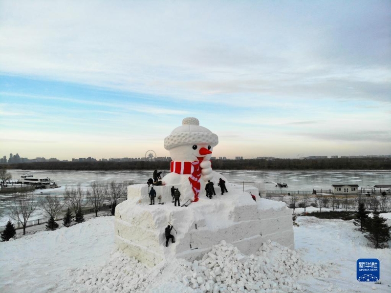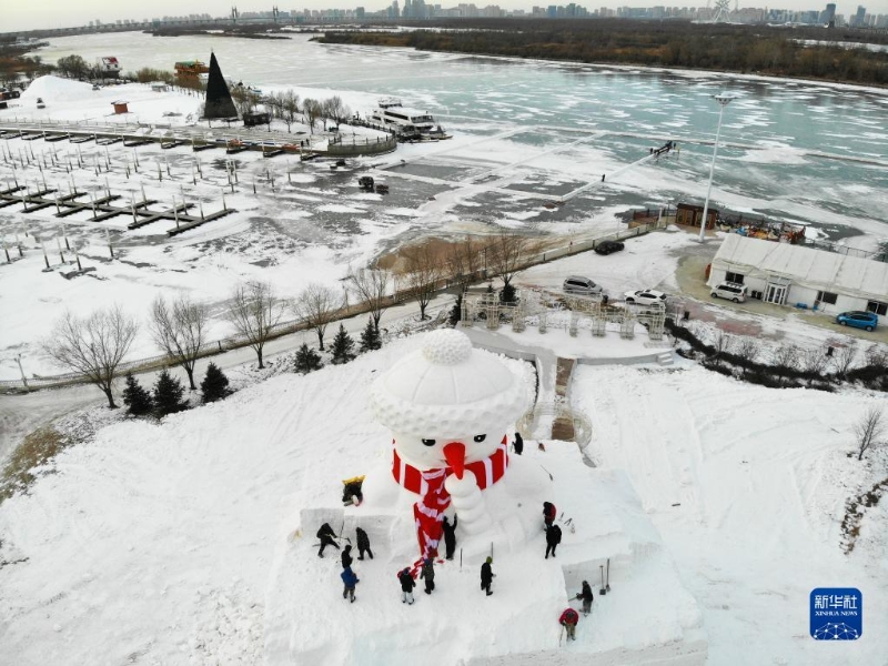 12月6日,工人在松花江哈爾濱段江畔搭建巨型雪人。