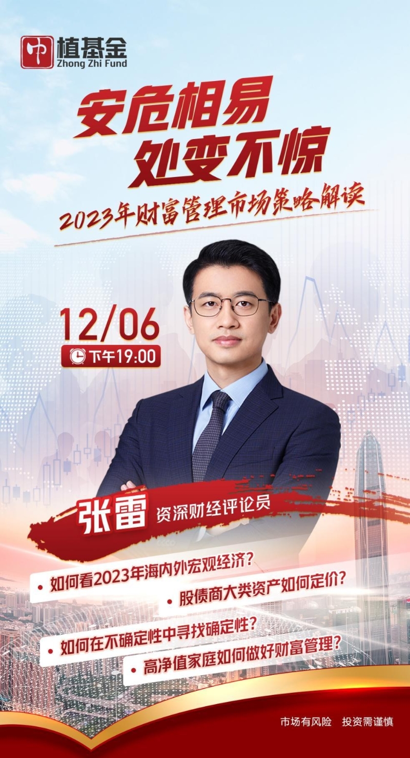 為此,北京中植基金銷售有限公司(以下簡稱:中植基金)“投研大腦”——CIO辦公室經(jīng)過專業(yè)研判,于12月6日重磅發(fā)布《2023年財富管理報告》(以下簡稱:《報告》),對以上問題一一作答,幫助投資者認清市場形勢,確定投資思路。當日晚19:00,中植基金邀請到新時代財富研究院資深財經(jīng)評論員張雷做客官方直播間,以”安危相易 處變不驚“為主題,帶領投資者對該報告進行深入解讀。