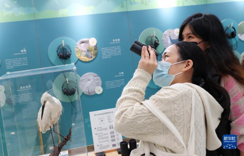 12月7日,參觀者在上海自然博物館體驗使用望遠鏡觀看遠處的鳥類圖片。