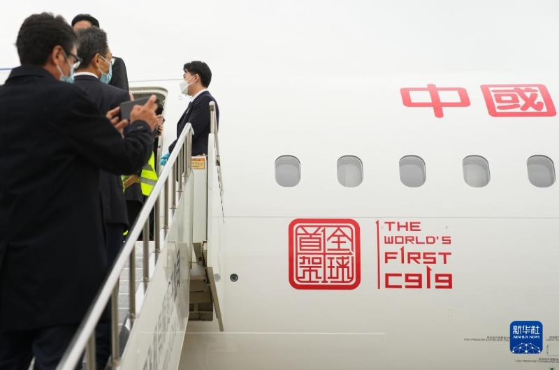 12月9日拍攝的國(guó)產(chǎn)大飛機(jī)C919交付全球首家用戶東航的儀式現(xiàn)場(chǎng)。