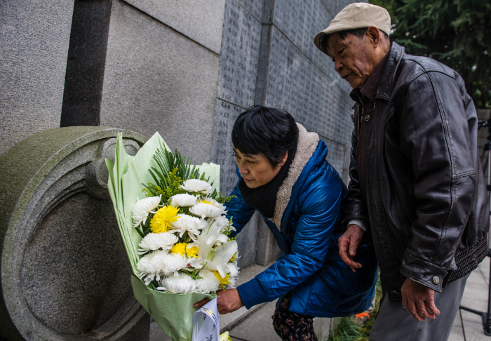 2014年12月7日,南京大屠殺幸存者常志強(qiáng)和女兒常小梅在家祭中向當(dāng)年遇難的親人獻(xiàn)花。新華社記者 沈鵬 攝