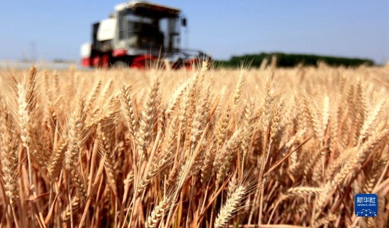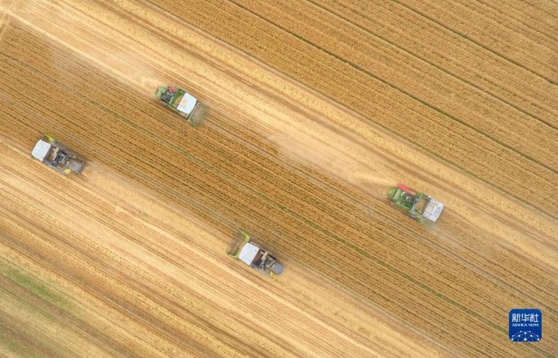 在山東省聊城市茌平區(qū)菜屯鎮(zhèn)任莊村,種糧大戶組織聯(lián)合收割機收獲小麥(無人機照片,6月12日攝)。新華社發(fā)(趙玉國 攝)