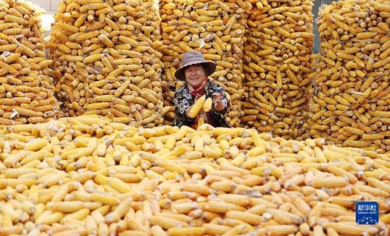 山東省臨沂市郯城縣郯城街道宋屯村村民在整理晾曬收獲的玉米(9月23日攝)。新華社發(fā)(張春雷 攝)