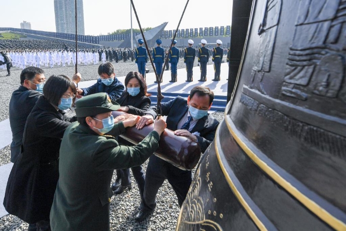 2022年12月13日,在南京大屠殺死難者國家公祭儀式現(xiàn)場,社會各界代表撞響“和平大鐘”。新華社記者 李博 攝