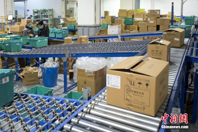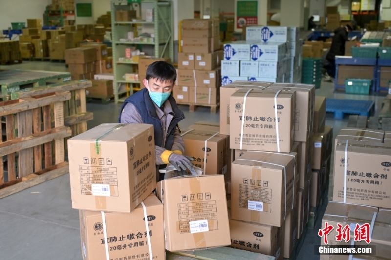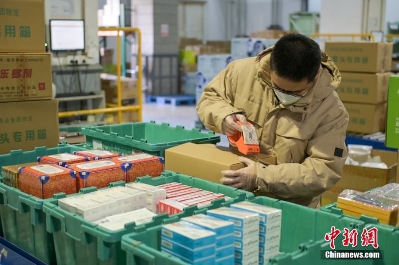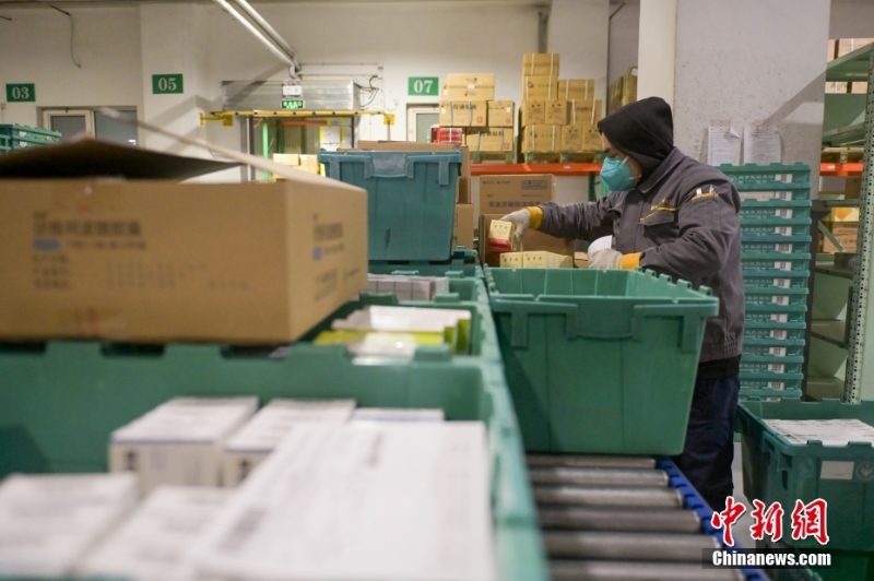 12月13日,北京,華潤醫(yī)藥商業(yè)集團(tuán)有限公司北京物流中心內(nèi),工作人員在分揀打包藥品。中新社記者 趙文宇 攝