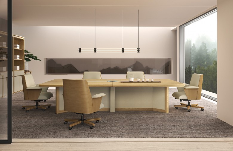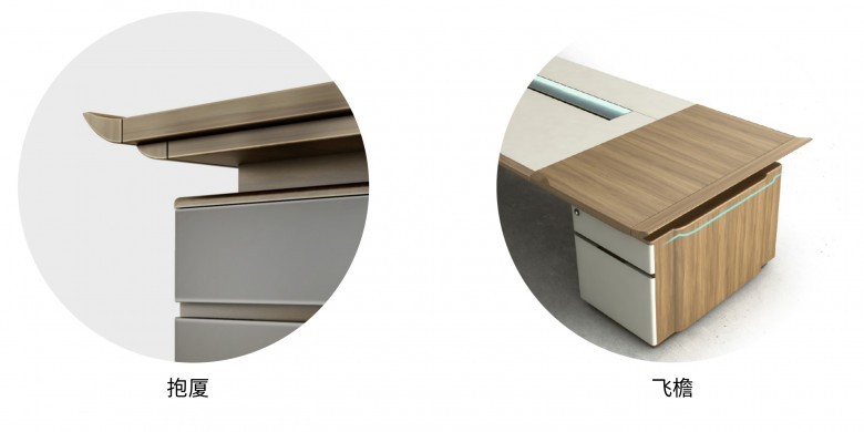 “御之和”極大程度突破傳統(tǒng)造型。靈感來自京外名剎之首的河北正定“隆興寺”獨特的“四出山花抱廈”建筑結(jié)構(gòu)特色,如四周墻面凸出成圍抱主體之勢,震旦家具取“抱廈”格局于主管桌,更包含禮遇上賓之意。