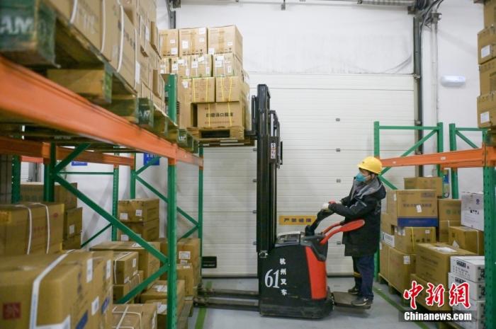 圖為工作人員駕駛叉車搬運(yùn)藥品。中新社記者 趙文宇 攝