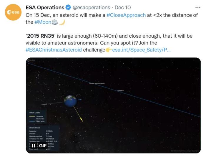 歐洲航天局推文寫(xiě)道,“小行星2015 RN35足夠大,且飛得很近,可以被業(yè)余天文學(xué)家觀(guān)測(cè)到。”