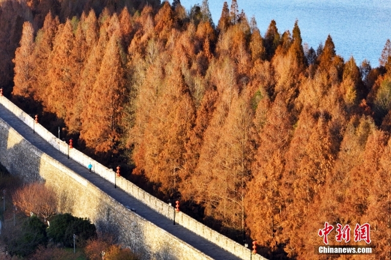 12月14日,江蘇南京,明城墻邊的玄武湖水杉呈現(xiàn)冬日壯觀景致。(無人機(jī)照片) 中新社記者 泱波 攝