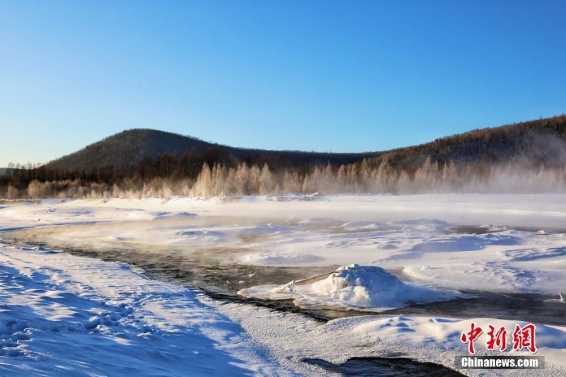 12月15日,受寒潮冷空氣影響,“中國最冷小鎮(zhèn)”黑龍江省大興安嶺呼中區(qū)出現(xiàn)強降溫天氣,最低氣溫達到-42.2℃,迎來今年入冬以來最冷一天。圖為當(dāng)?shù)睾恿魃蠌浡粚颖F。 中新社發(fā) 馮宏偉 攝
