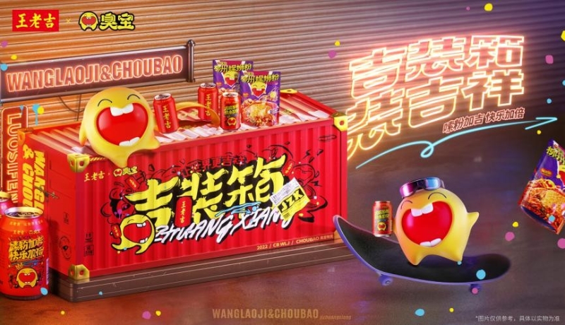雙方推出王老吉×臭寶吉裝箱聯(lián)名禮盒,包含各自的明星產(chǎn)品:王老吉紅罐涼茶與臭寶爆爆濃湯柳州螺螄粉,其中涼茶罐身采用聯(lián)名定制設(shè)計(jì)。禮盒取意“吉裝箱,裝吉祥”,大膽采用仿集裝箱的炫酷外形,提取王老吉經(jīng)典的紅黃配色,元素上既有臭寶的萌趣IP形象,也包含王老吉的“吉文化”符號(hào),營(yíng)造歡樂(lè)喜慶的氛圍的同時(shí),傳遞好運(yùn)吉祥寓意,打開(kāi)年輕人聚會(huì)的大門,滿足其有顏有趣有個(gè)性的需求。