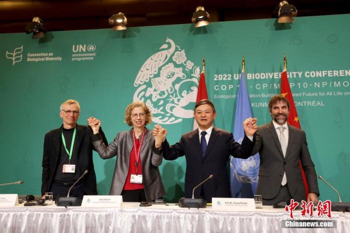當?shù)貢r間12月20日,加拿大蒙特利爾,在《生物多樣性公約》第十五次締約方大會(COP15)第二階段會議最后一場記者會上,COP15主席、中國生態(tài)環(huán)境部部長黃潤秋(右二)、聯(lián)合國副秘書長兼聯(lián)合國環(huán)境規(guī)劃署執(zhí)行主任安德森(右三)、加拿大環(huán)境與氣候變化部長吉爾博(右一)及聯(lián)合國《生物多樣性公約》秘書處副執(zhí)行秘書庫珀共同挽手祝賀會議取得成功。由中國擔任主席國的COP15第二階段會議在完成各項議程后,于當日凌晨結(jié)束。 中新社記者 余瑞冬 攝