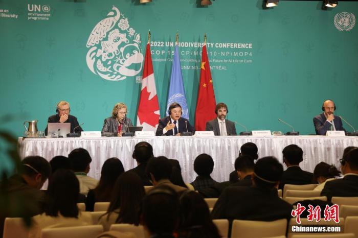 當?shù)貢r間12月20日,加拿大蒙特利爾,在《生物多樣性公約》第十五次締約方大會(COP15)第二階段會議最后一場記者會上,COP15主席、中國生態(tài)環(huán)境部部長黃潤秋(中)以多個“歷史性”來形容此次會議的成果文件。由中國擔任主席國的COP15第二階段會議在完成各項議程后,于當日凌晨結(jié)束。 中新社記者 余瑞冬 攝
