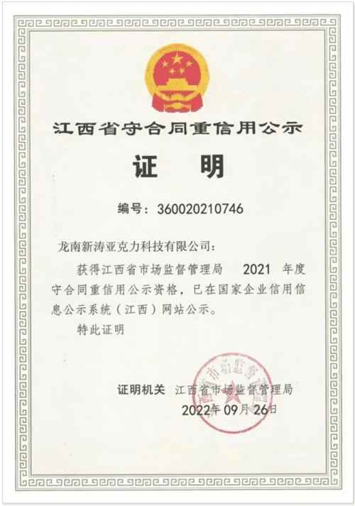 近期,江西省市場監(jiān)管局辦公室發(fā)布了《關(guān)于公布2021年度江西省守合同重信用公示單位的通知》,龍南新濤亞克力科技有限公司榮膺在列,并已獲得公示,這是龍南新濤繼獲得“贛州市守合同重信用公示單位”稱號以來的又一新成績。