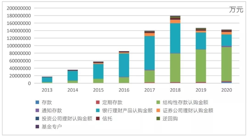 以上市公司為例,2017年以來上市公司購買理財(cái)產(chǎn)品規(guī)模水平有大幅提升,2020年投資規(guī)模達(dá)到了14276億元。從投資產(chǎn)品類型來看,包括銀行理財(cái)、結(jié)構(gòu)性存款、通知存款、證券公司理財(cái)產(chǎn)品、投資公司理財(cái)產(chǎn)品、信托計(jì)劃、基金專戶以及逆回購等理財(cái)產(chǎn)品,理財(cái)產(chǎn)品種類不斷豐富。