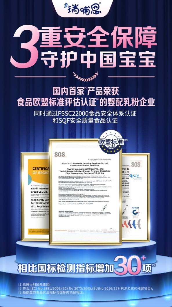 以創(chuàng)新為動力,以品質為根基,承載守護國民健康的責任初心,為了更好地提升產品品質,蒙牛瑞哺恩對標全球最嚴歐盟標準開啟覆蓋奶源、生產、加工全方位的質量升級,交出國內4家工廠順利拿下國際權威認證機構SGS授予的歐盟食品標準認證的好成績,更成為國內首款榮獲食品歐盟標準評估認證的嬰配乳粉產品,持續(xù)保持行業(yè)質量標桿地位。