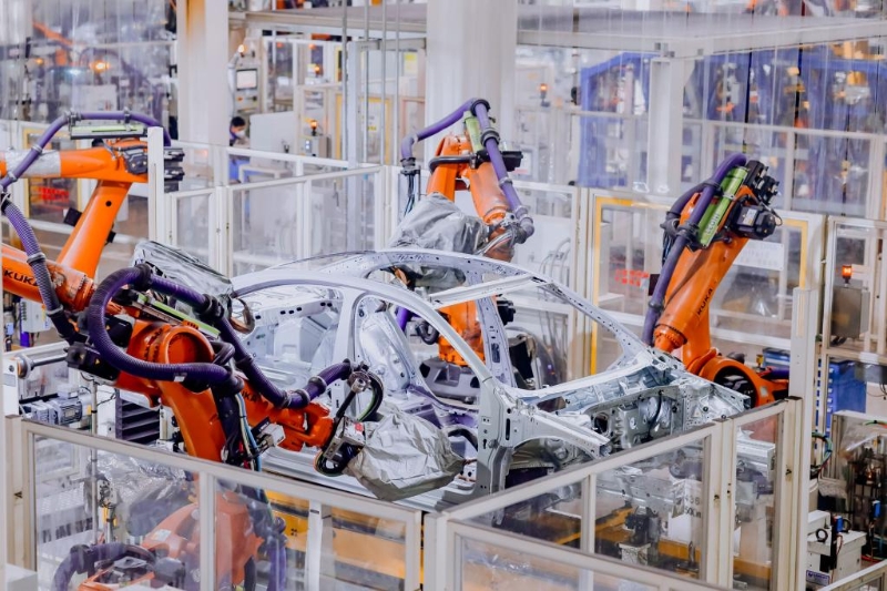 12月20日,在位于山東省青島市即墨區(qū)的一汽—大眾華東基地焊裝車間,機(jī)器人進(jìn)行焊接作業(yè)。新華社發(fā)(梁孝鵬 攝)