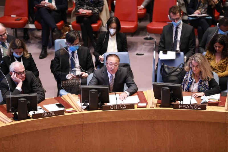 4月5日,在位于紐約的聯(lián)合國(guó)總部,中國(guó)常駐聯(lián)合國(guó)代表張軍(前排中)在安理會(huì)烏克蘭局勢(shì)公開(kāi)會(huì)上闡述中方關(guān)于當(dāng)前烏克蘭局勢(shì)的立場(chǎng)主張,強(qiáng)調(diào)推動(dòng)烏克蘭局勢(shì)降級(jí),盡早?;鹬箲?zhàn),是國(guó)際社會(huì)的迫切期待,也是中方的強(qiáng)烈愿望。新華社記者謝鍔攝