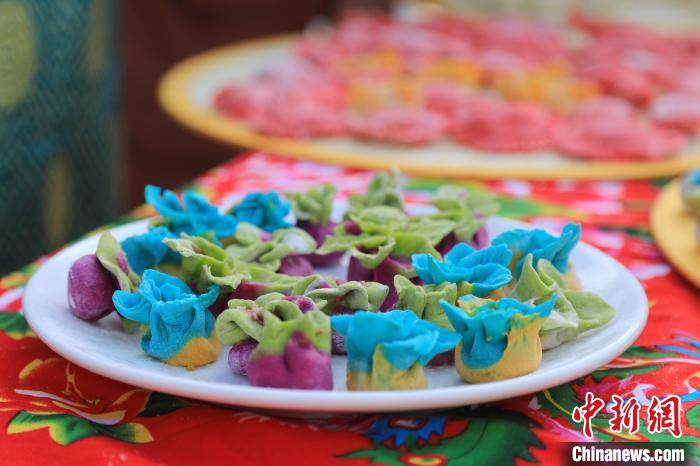 村民們展示五彩餃子?!『嚏?攝