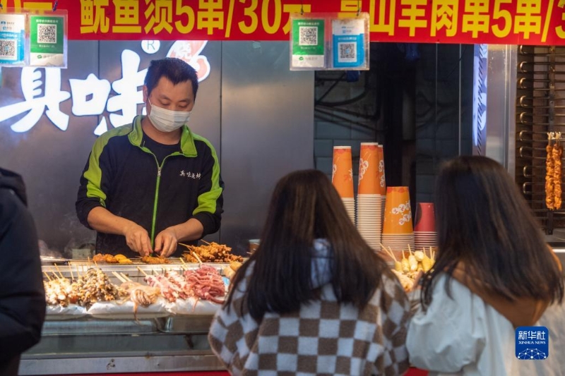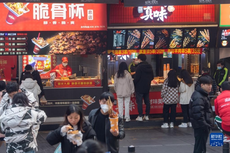 12月23日,在位于重慶解放碑商圈的八一路好吃街上,市民游客挑選小吃美食。