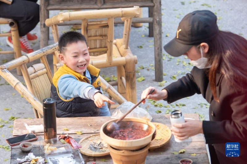 12月24日,在位于重慶解放碑商圈的著名景點(diǎn)山城巷的一家店內(nèi),游客品嘗特色餐飲。