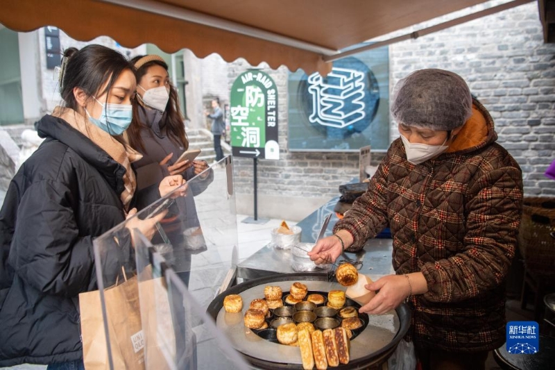 12月23日,在位于重慶解放碑商圈的八一路好吃街上,商家為顧客制作小吃。