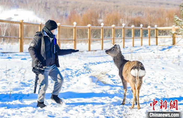 圖為游客與鹿苑的梅花鹿互動?!“柹绞形麄鞑抗﹫D