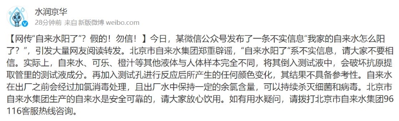 實際上,自來水、可樂、橙汁等其他液體與人體樣本完全不同,將其倒入測試液中,會破壞抗原提取管里的測試液成分。再加入測試孔進行反應(yīng)后所產(chǎn)生的任何顏色變化,其結(jié)果不具備參考性。自來水在出廠之前會經(jīng)過加氯消毒處理,且出廠水中保持一定的余氯含量,可以持續(xù)殺滅細菌和病毒。北京市自來水集團生產(chǎn)的自來水是安全可靠的,請大家放心飲用。如有用水疑問,請撥打北京市自來水集團96116客服熱線咨詢。