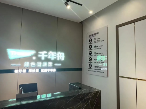 綠色的品牌logo體現(xiàn)著千年舟打造綠色、環(huán)保、高品質(zhì)板材及其配套產(chǎn)品的理念。細(xì)看墻上還貼著舟到服務(wù)五大標(biāo)準(zhǔn),為顧客提供良好服務(wù)也是千年舟的宗旨之一。