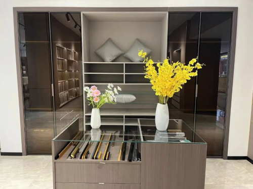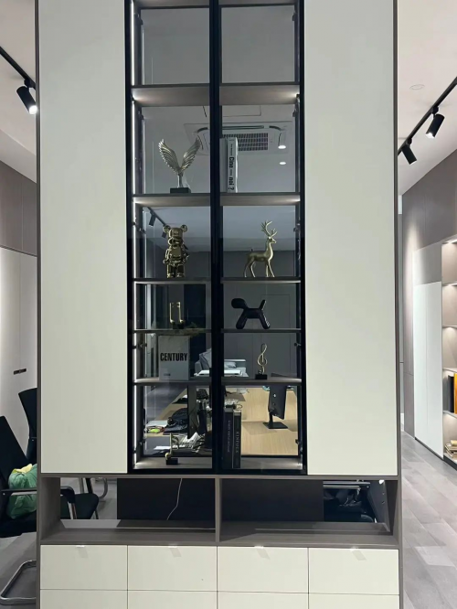 隔斷柜整體半透明設(shè)計(jì)滿足了隔斷、儲(chǔ)物、展示及裝飾需求,虛實(shí)結(jié)合,有曲徑通幽的意境之美。