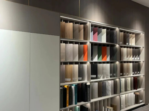 一整面淺色系的選樣柜上陳列的是各種花色的板材,可給顧客提供更多的花色選擇。