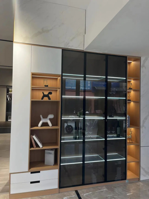 書柜采用了透明玻璃和木制板柜的結(jié)合,隱約可見里面的裝飾物,可以體現(xiàn)出主人的文化氣質(zhì)。左右兩邊的木柜有燈光點(diǎn)綴,又格外引人注目。