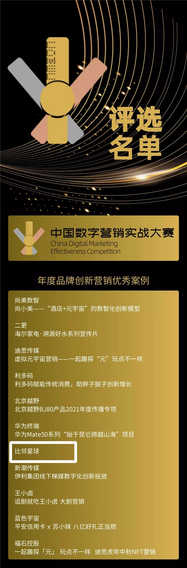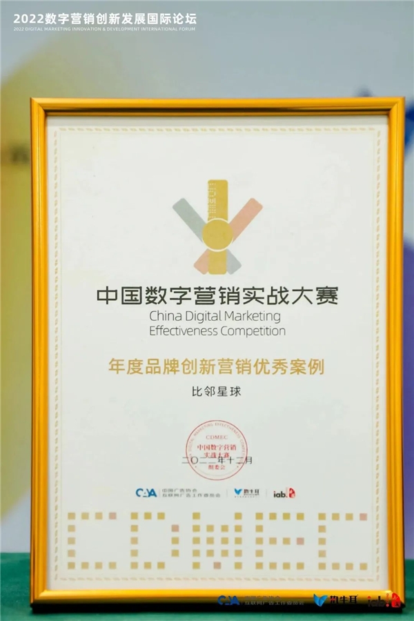 12月22日,第29屆中國(guó)國(guó)際廣告節(jié) · 2022數(shù)字營(yíng)銷創(chuàng)新發(fā)展國(guó)際論壇在廈門隆重舉行,并于現(xiàn)場(chǎng)揭曉“中國(guó)數(shù)字營(yíng)銷實(shí)戰(zhàn)大賽”評(píng)選結(jié)果。比鄰星球從眾多參賽企業(yè)的激烈角逐中脫穎而出,榮獲年度品牌創(chuàng)新?tīng)I(yíng)銷優(yōu)秀案例。