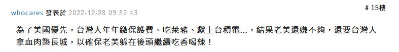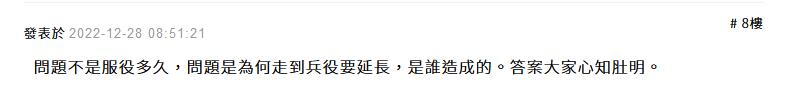 有臺灣網(wǎng)友直言:“問題不是服役多久,問題是為何走到兵役要延長,是誰造成的。答案大家心知肚明”。還有網(wǎng)友諷刺,“票投民進(jìn)黨,青年上戰(zhàn)場”“為了美國優(yōu)先,臺灣人年年繳保護(hù)費、吃萊豬、獻(xiàn)上臺積電……結(jié)果老美還嫌不夠……”。