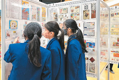 在中華基金中學(xué)寬敞的禮堂內(nèi),30塊郵票展板整齊排列,黏貼著近千張大小各異的郵品和紀(jì)念封。從辛亥革命到香港回歸,從萬(wàn)里長(zhǎng)城到十二生肖,從北京奧運(yùn)到航天科技……這一枚枚僅數(shù)厘米見(jiàn)方、難得一見(jiàn)的珍貴郵票,有些已泛黃發(fā)舊,有些則蓋滿郵戳,無(wú)一不是歷史的縮影,見(jiàn)證著時(shí)代變遷。學(xué)生們?nèi)宄扇?,一邊觀賞一邊討論著郵票內(nèi)容,氣氛熱烈。