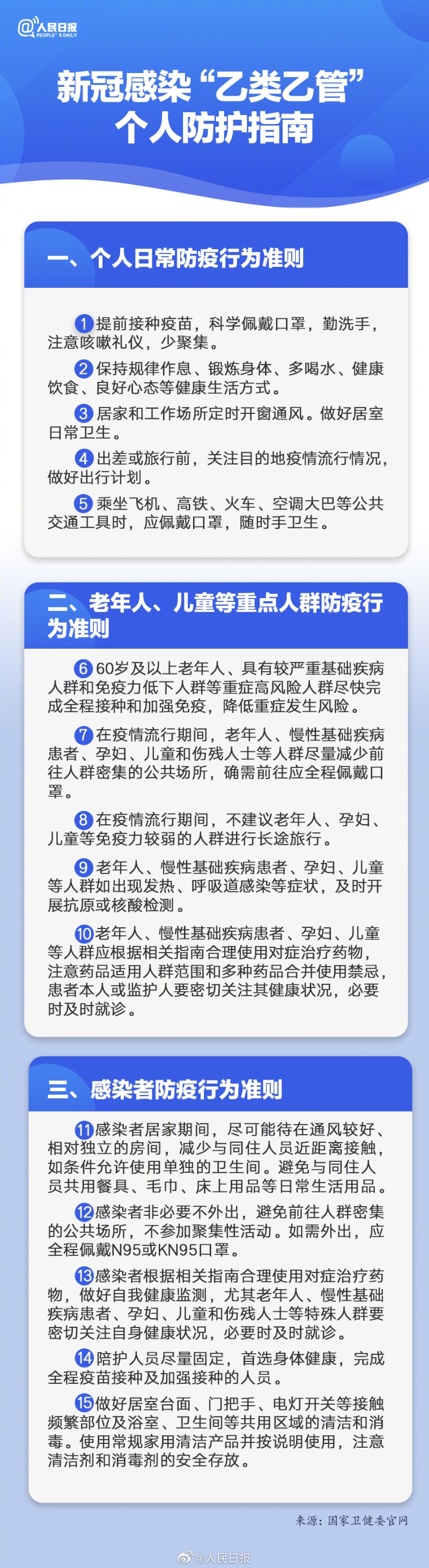 國(guó)務(wù)院聯(lián)防聯(lián)控機(jī)制綜合組制定《新型冠狀病毒感染“乙類乙管”個(gè)人防護(hù)指南》,涵蓋個(gè)人日常防疫行為準(zhǔn)則、老年人兒童等重點(diǎn)人群防疫行為準(zhǔn)則、感染者防疫行為準(zhǔn)則。轉(zhuǎn)發(fā)提醒!