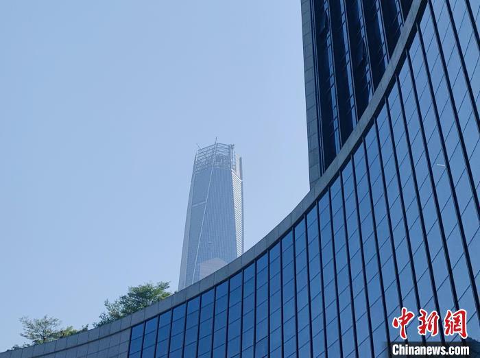 資料圖:藍(lán)天下,東莞市中心的高樓。 王堅 攝