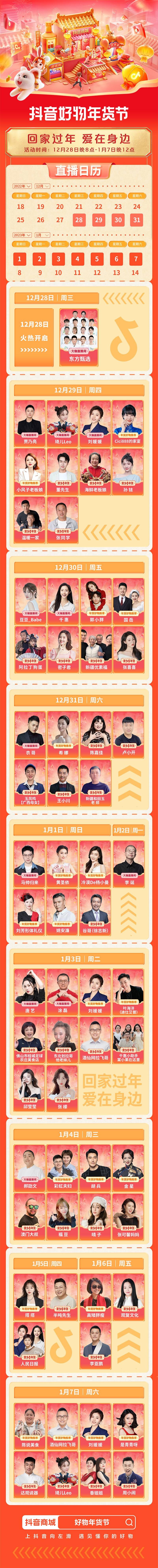 強文化屬性直播間東方甄選領(lǐng)銜出擊,澳門大叔、琦兒、海鮮老板娘、賈乃亮、劉媛媛、密子君等站內(nèi)頭部主播緊隨其后,天天有接棒,日日播不停,年貨直播間持續(xù)連播直到1月7日,共同打造一場紅火有趣的年貨直播嘉年華。