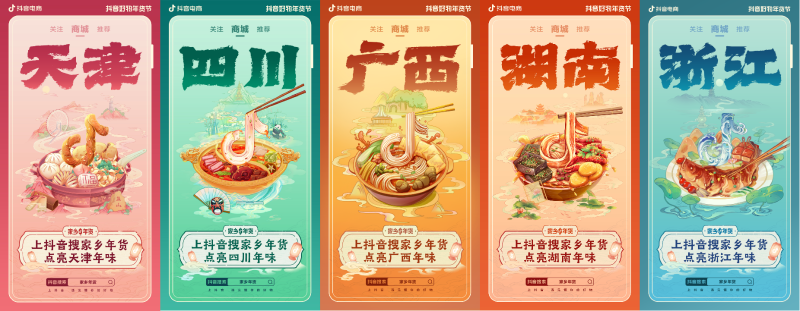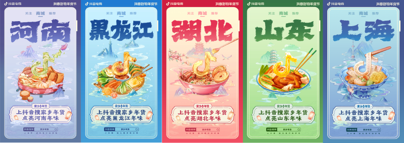 年貨不僅是貨,還是國人從不缺席的儀式感。新年腳步將近,抖音電商發(fā)起“抖音好物年貨節(jié)—家鄉(xiāng)年貨”活動,并推出一組家鄉(xiāng)年貨地域特色海報,“浙江的東坡肉,安徽的板面……”,集合天南海北年俗年味,營造濃厚春節(jié)氛圍。