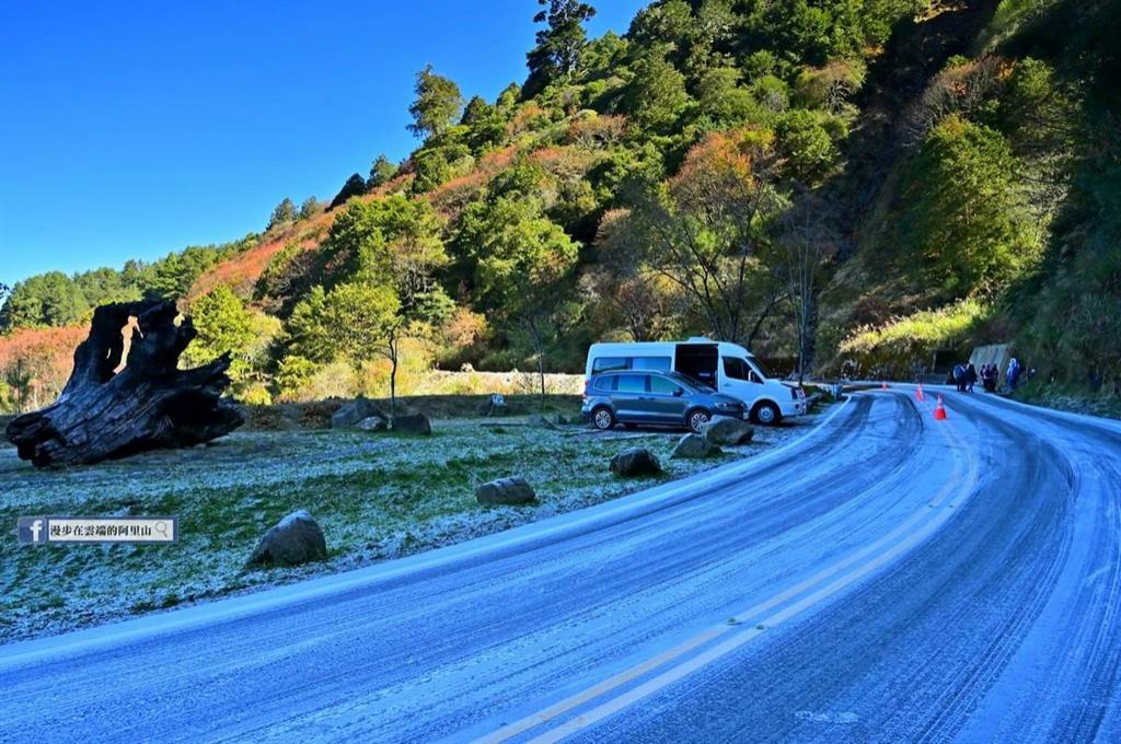 黃源明說,阿里山海拔2200公尺至2500公尺左右,塔塔加更高,海拔高度還要再多2、300公尺,28日當(dāng)天玉山塔塔加的臺18線新中橫公路沿途多處背光路面幾乎都是一層白霜,鹿林神木過后更是明顯,即使車輛經(jīng)過輾壓,中午柏油路面白霜依舊,未見消融。