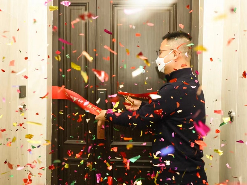 工作人員剪彩祝賀業(yè)主喜接新居