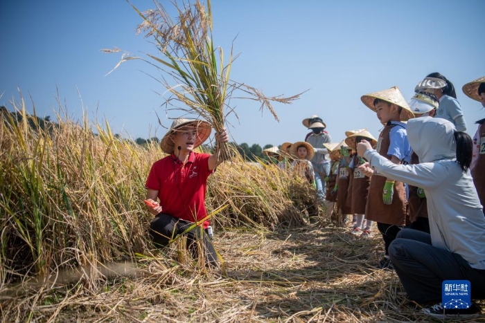 10月18日,小朋友們在“一心回鄉(xiāng)”生態(tài)農(nóng)場體驗收割稻谷。新華社記者 伍志尊 攝