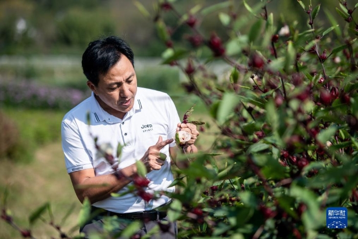 10月18日,“一心回鄉(xiāng)”生態(tài)農(nóng)場負(fù)責(zé)人蔡三益在介紹洛神花長勢。新華社記者 伍志尊 攝