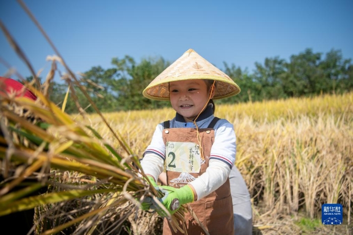 10月18日,小朋友在“一心回鄉(xiāng)”生態(tài)農(nóng)場體驗收割稻谷。新華社記者 伍志尊 攝