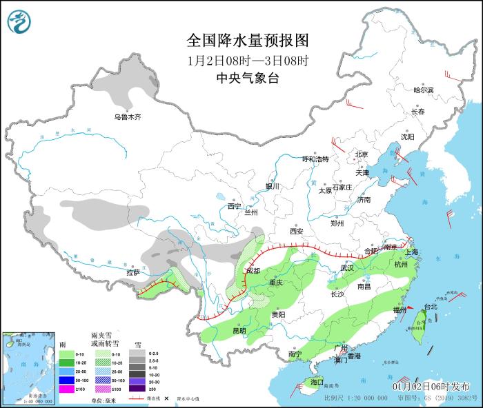 全國降水量預(yù)報圖(1月2日08時-3日08時)。圖片來源:中央氣象臺網(wǎng)站