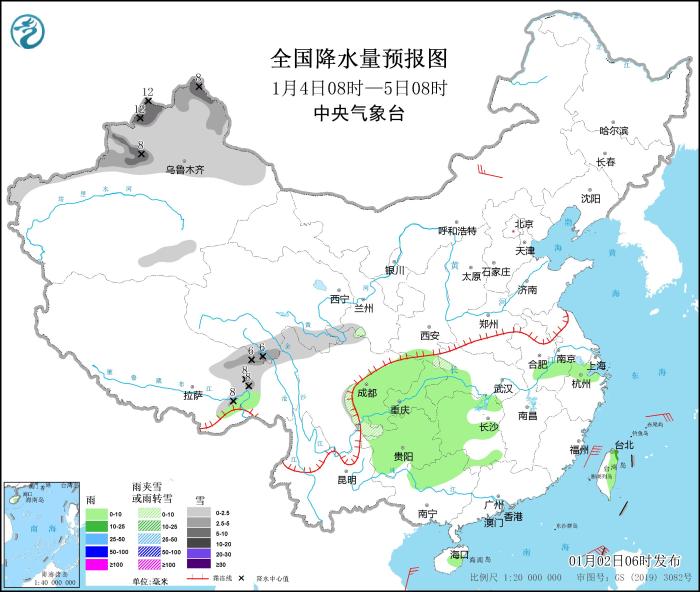1月4日08時至5日08時,新疆北部、西藏東部、青海南部、四川西北部等地部分地區(qū)有小到中雪或雨夾雪,其中,新疆北疆北部和伊犁河谷等地局地有大到暴雪(10~12毫米)。四川盆地大部、重慶、貴州、湖北西部、湖南大部、廣西北部、安徽南部、浙江北部、臺灣島中東部等地部分地區(qū)有小雨,局地中雨。內(nèi)蒙古中部部分地區(qū)有4~5級風(fēng)。東海南部、臺灣海峽、臺灣以東洋面、巴士海峽、南海大部海域?qū)⒂?~7級、陣風(fēng)8~9級的大風(fēng),其中南海東北部和南部的部分海域風(fēng)力可達(dá)8~9級、陣風(fēng)10級。
